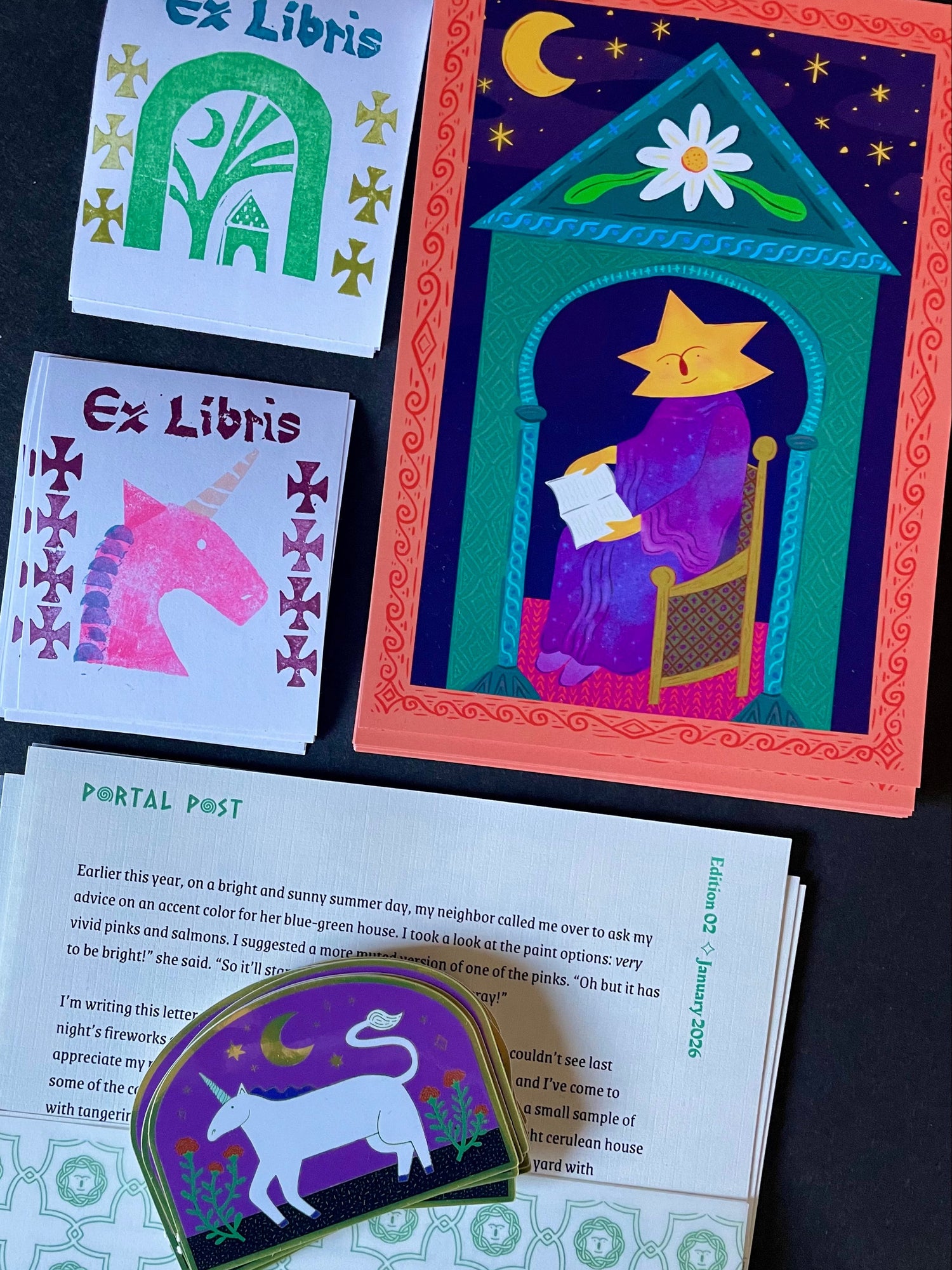 Portal Post is a mail club by artist Sam Kelly. Each month, members receive an envelope with an art print, stickers, a letter, and other little surprises.